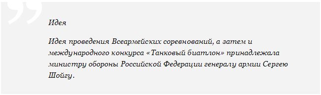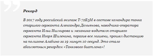 - «Танковый биатлон» проводится по правилам, которые хорошо известны всем участникам, они просты, понятны и не меняются. На трассе в Алабино произведены незначительные улучшения в оборудовании ряда препятствий и будут усложнены мишенные поля - это добавит состязаниям зрелищности.