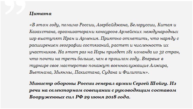 Фактически «Танковый биатлон» стал родоначальником Армейских международных игр. В 2014 году в конкурсе участвовали военные профессионалы уже из 12 стран, в том числе из Индии и Китая. В 2016 году присоединился Иран. В 2017 году в подмосковное Алабино приехали танкисты из 19 армий. Теперь полку участников еще прибыло.