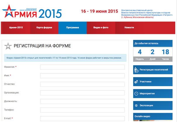 На портале Международного форума «Армия -2015» подключен функционал регистрации посетителей