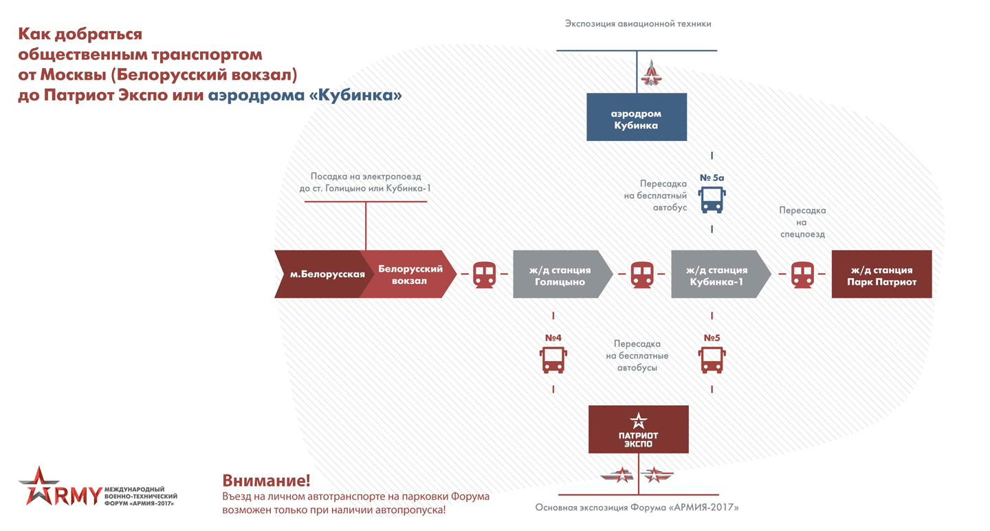 Далее от станции «Кубинка-1» – бесплатным автобусом Форума (Маршрут №5) до КВЦ «Патриот».