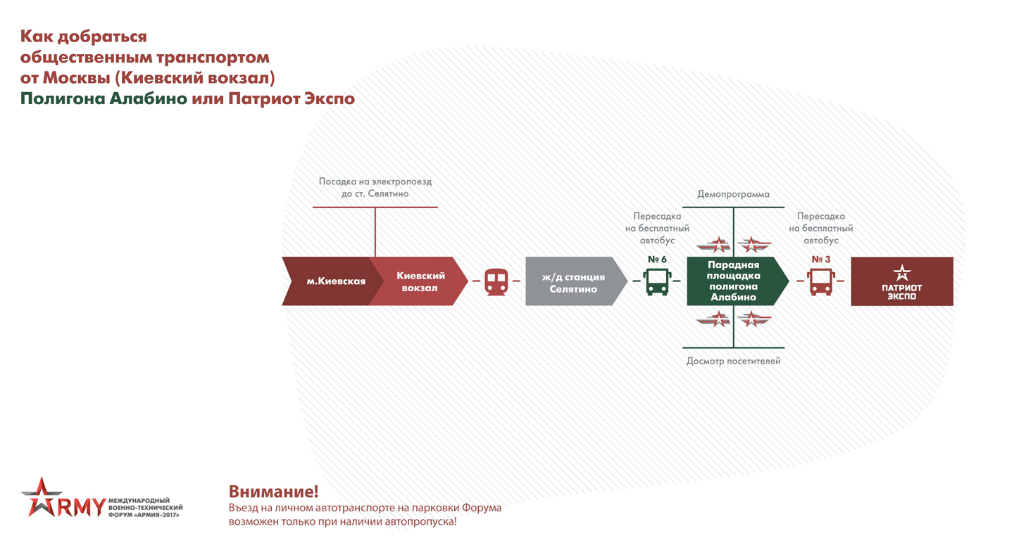 Далее – бесплатным автобусом Форума (Маршрут №6) до парадной площадки полигона «Алабино». Режим работы автобусов с 9:00 до 19:00 с интервалом 5-7 мин.