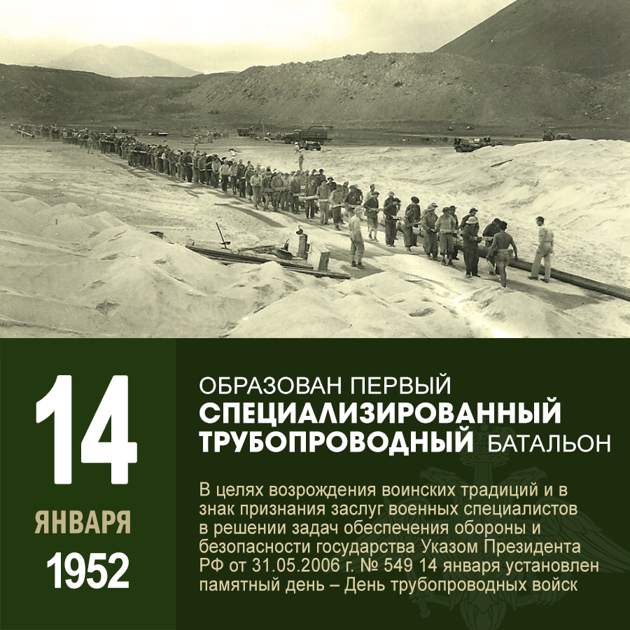 14 января 1952 года маршал Советского Союза А.Василевский подписал указ «О создании специализированного трубопроводного батальона». Эта дата стала днем образования трубопроводных войск.
