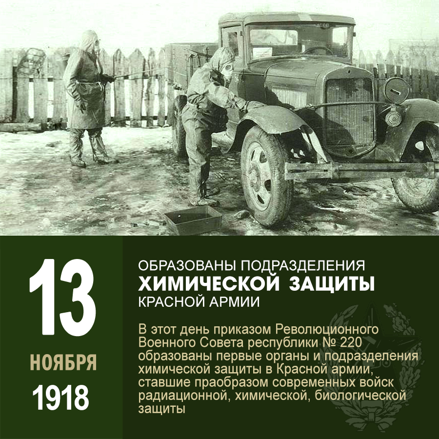 История войск РХБ защиты берет начало с 13 ноября 1918 года, когда приказом Реввоенсовета Республики № 220 была создана химическая служба РККА и стали формироваться первые органы и подразделения противохимической защиты.