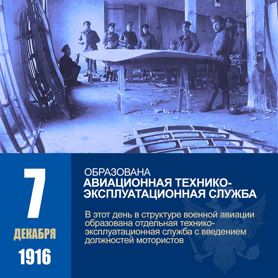С 7 декабря 1916 года идет отсчет деятельности управления технической эксплуатации и войскового ремонта авиационной техники и вооружения ВВС. В составе первых авиаподразделений Российской империи предусмотрены должности мотористов, которые осуществляли техническое обеспечение полётов.
