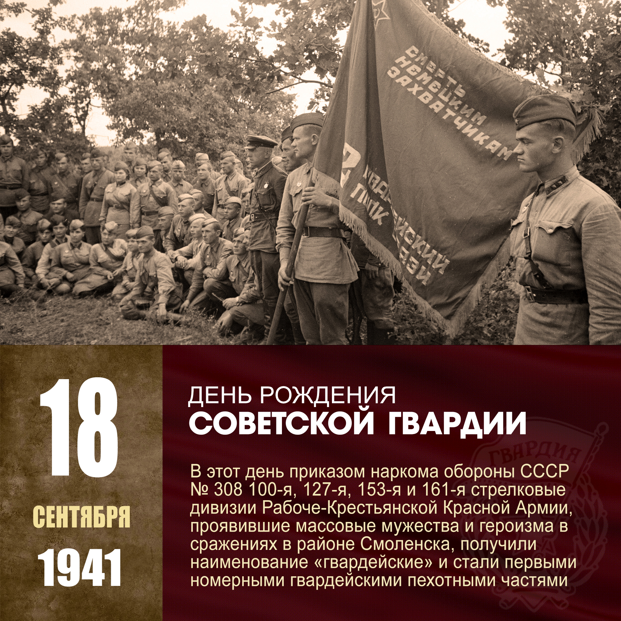 Днем рождения советской гвардии считается 18 сентября 1941 года. В этот день по приказу наркома обороны СССР № 308 100-я, 127-я, 153-я и 161-я стрелковые дивизии Рабоче-Крестьянской Красной Армии, которые в августе 1941 года показали высоты мужества и героизма в сражениях в районе Смоленска, получили наименование «гвардейские» и стали первыми номерными гвардейскими пехотными частями.