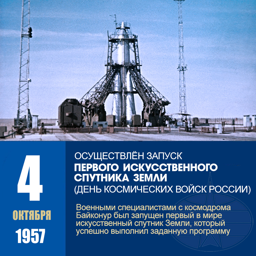 Этот памятный день в Вооруженных силах РФ установлен Указом президента Российской Федерации № 549 от 31 мая 2006 года и приурочен к дню запуска первого искусственного спутника Земли, открывшего летопись космонавтики, в том числе и военной. 4 октября 1957 года военными специалистами с космодрома Байконур был запущен первый в мире искусственный спутник Земли, который успешно выполнил заданную программу.