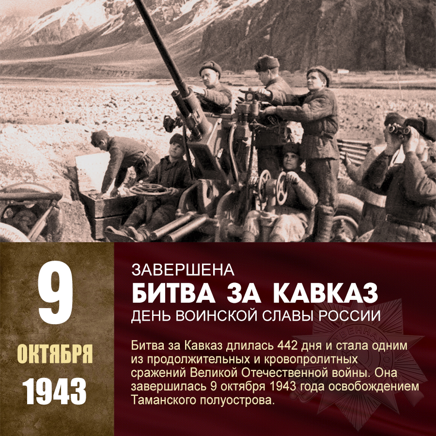 День воинской славы России – День разгрома советскими войсками немецко-фашистских войск в битве за Кавказ (1943 год), отмечаемый 9 октября, установлен летом 2020 года. Соответствующие поправки в Федеральный закон «О днях воинской славы и памятных датах России» были внесены Указом Президента РФ № 284-ФЗ от 31 июля 2020 года.