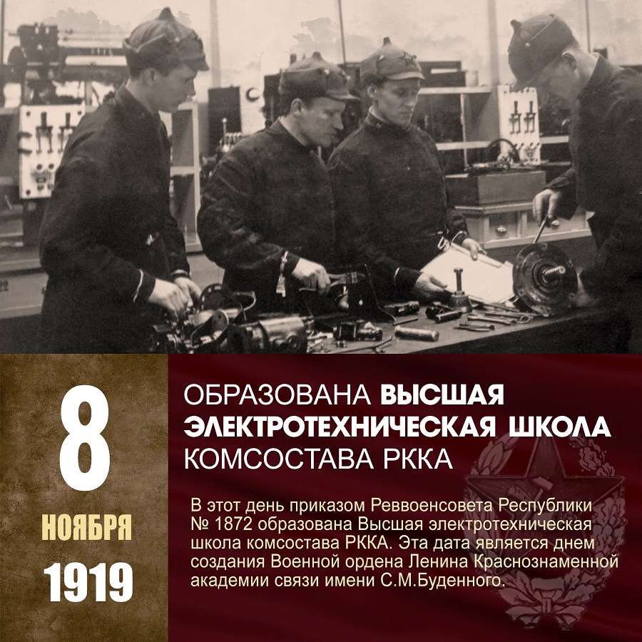 8 ноября 1919 года электротехнический отдел Высшей советской военно-инженерной школы приказом Реввоенсовета Республики № 1872 был преобразован в самостоятельное военно-учебное заведение – Высшую электротехническую школу комсостава Рабоче-крестьянской Красной Армии (РККА). Эта дата и является днем создания Военной ордена Ленина Краснознаменной академии связи имени С.М.Буденного.
