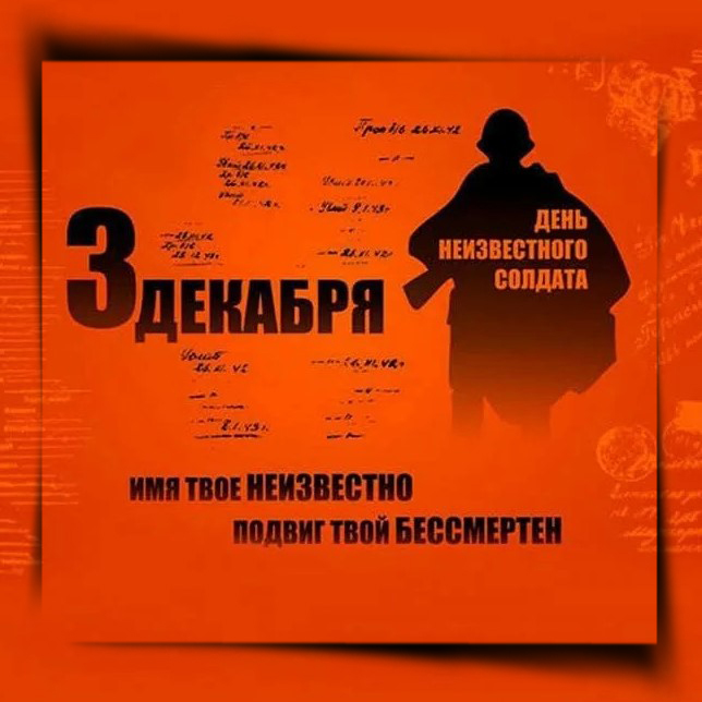 3 декабря в России отмечается День неизвестного солдата. Памятная дата была установлена Федеральным законом «О внесении изменений в статью 1-1 Федерального закона «О днях воинской славы и памятных датах России», подписанным президентом Российской Федерации 4 ноября 2014 года, в целях увековечения памяти, воинской доблести и бессмертного подвига российских и советских воинов, погибших в боевых действиях на территории нашей страны или за ее пределами, чьи имена остались неизвестными.