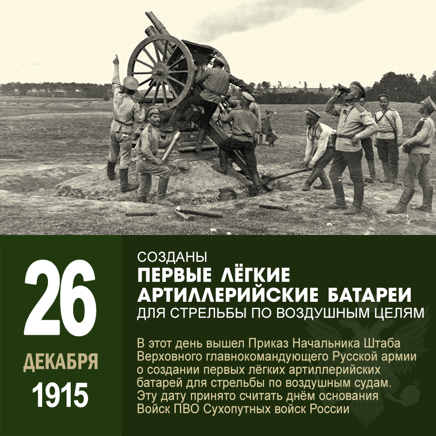 Впервые серьёзная необходимость в создании подразделений, обеспечивающих прикрытие общевойсковых соединений с воздуха, стала очевидной в годы Первой мировой войны. В связи с этим, (13) 26 декабря 1915 года вышел Приказ Начальника Штаба Верховного главнокомандующего Русской армии генерала Алексеева о создании первых лёгких артиллерийских батарей для стрельбы по воздушным судам. Эту дату и принято считать днём основания Войск ПВО Сухопутных войск России. Соответствующий Приказ Министра Обороны РФ вышел в феврале 2007 года.