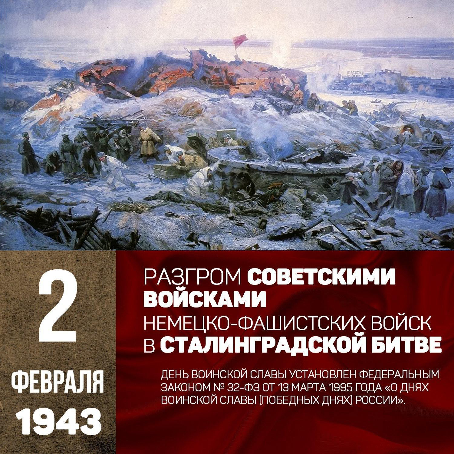 День воинской славы — День разгрома советскими войсками немецко-фашистских войск в Сталинградской битве (1943 год) — отмечается в России ежегодно 2 февраля. Он установлен Федеральным законом № 32-ФЗ от 13 марта 1995 года «О днях воинской славы (победных днях) России».