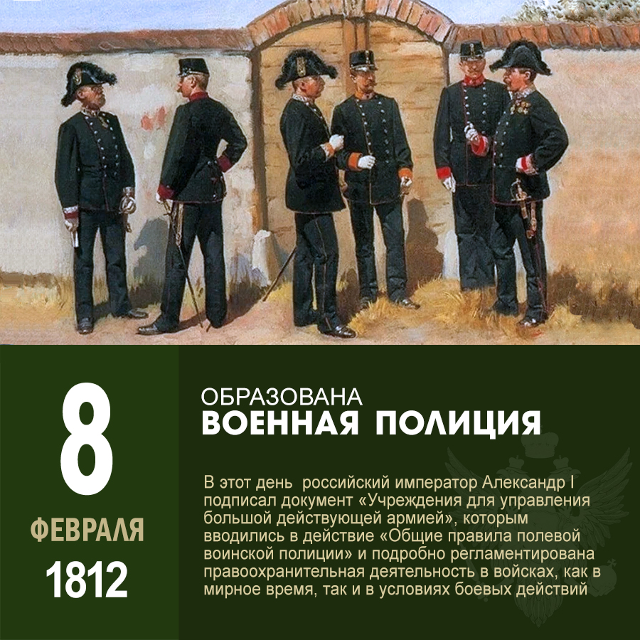 Хотя нужно сказать, что и ранее в русской армии были люди, которые отвечали за дисциплину и порядок в расположении войск. Так, при Петре I, когда шло формирование регулярной армии в государстве, за это отвечали «полковые обер-полицмейстеры». Однако как централизованная и чётко сформированная структура вооруженных сил страны военная полиция была создана позднее.