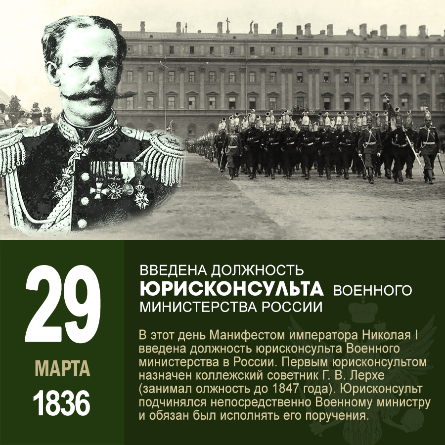 Однако, ключевым моментом в становлении юридических подразделений в армии явилось учреждение 29 марта 1836 года должности юрисконсульта Военного министерства, положившее начало формированию специального органа, непосредственно осуществляющего функции юридической службы в системе центрального военного управления. Именно эта дата и была взята для учреждения Дня специалиста юридической службы.