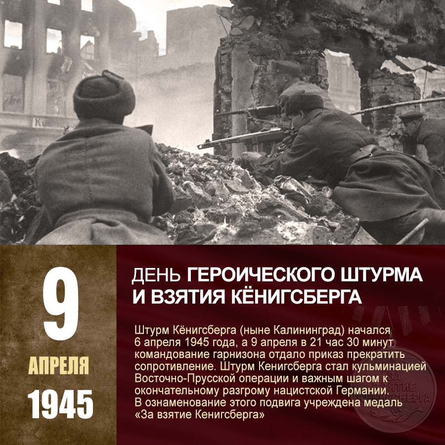 Штурм Кёнигсберга (ныне Калининград) начался 6 апреля 1945 года, а 9 апреля в 21 час 30 минут командование гарнизона города отдало приказ прекратить сопротивление.