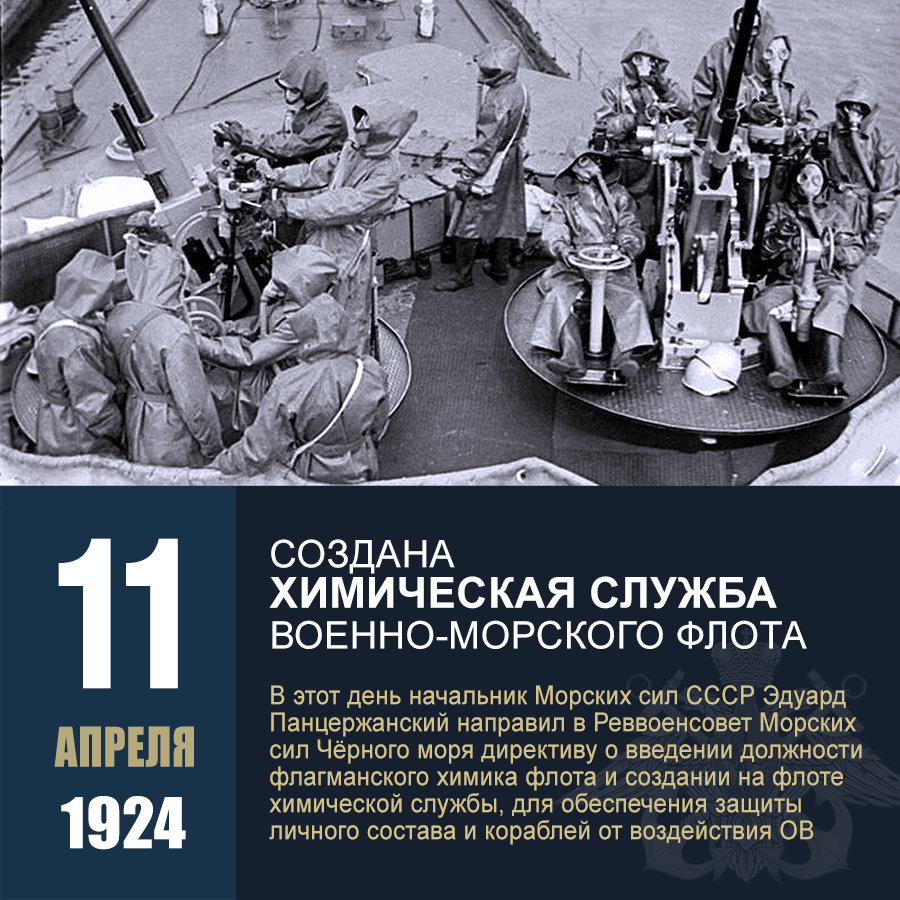 А 11 апреля 1924 года начальник Морских сил СССР Эдуард Панцержанский направил в Реввоенсовет Морских сил Чёрного моря директиву о создании на флоте химической службы и назначении флагманского химика флота. В директиве указывалось, что введение химических средств борьбы потребовало создания организации, способной использовать это оружие и обеспечить защиту личного состава и кораблей от воздействия отравляющих веществ. В директиве, в частности, говорилось: «Введение нового рода оружия — химических средств борьбы широко поставило перед флотом задачу создать организацию, способную широко использовать этот род оружия... обеспечить, по возможности, полную защиту личного состава и кораблей от воздействия ОВ».