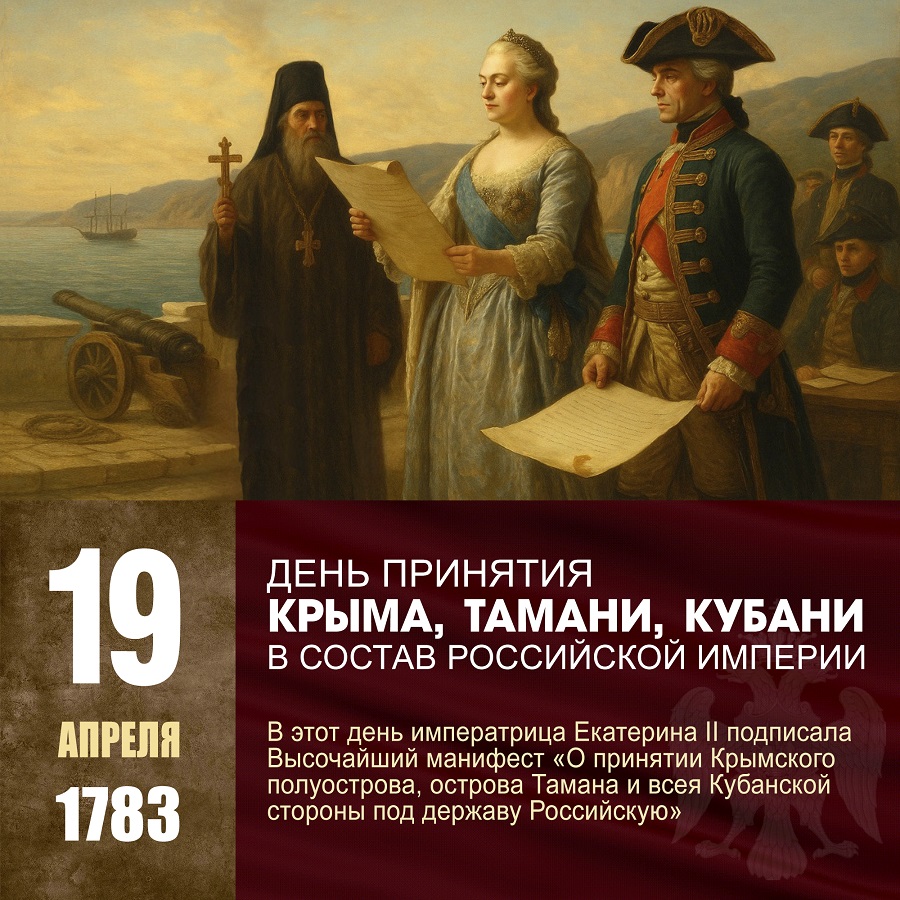 Начиная с 2019 года 19 апреля в России отмечается памятная дата, установленная Федеральным Законом РФ № 336-ФЗ в августе 2018 года, — День принятия Крыма, Тамани и Кубани в состав Российской империи (1783 год).